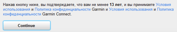 Нажав кнопку Continue, вы подтверждаете, что вам не менее 13 лет, и вы принимаете Условия использования и Политика конфиденциальности Garmin и Условия использования и Политика конфиденциальности Garmin Connect. Нажимаем на кнопку: Continue (Продолжить).