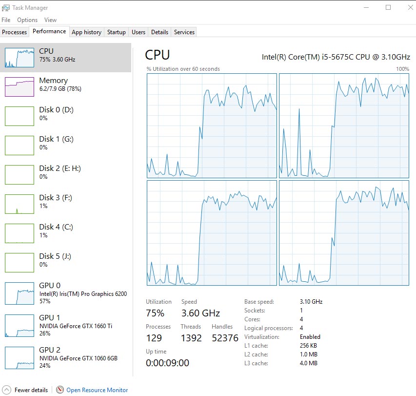 Загрузка, CPU - 75%, iGPU - 57%, GPU (GeForce GTX 1660 Ti/GeForce GTX 1060) - 26/24%.