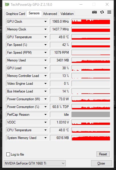 Поэтому используем утилиту GPU-Z для определения степени загрузки видеокарты. GPU дискретной карточки Palit GeForce GTX 1660 Ti StormX OC работал на частоте 1965МГц, утилизировано было 3401Мб видеопамяти (для 4K@30p), загрузка GPU - 38%.