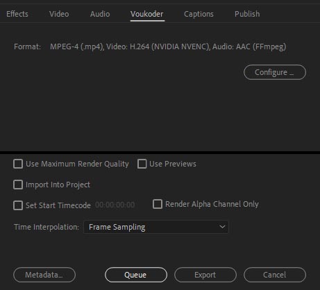 Отправляем эпизод на экспорт (Ctrl+M) и в Настройках экспорта (Export Settings), выбираем Формат: Voukoder R2. Переключаемся на закладку Voukoder и нажимаем там на кнопку Configure...