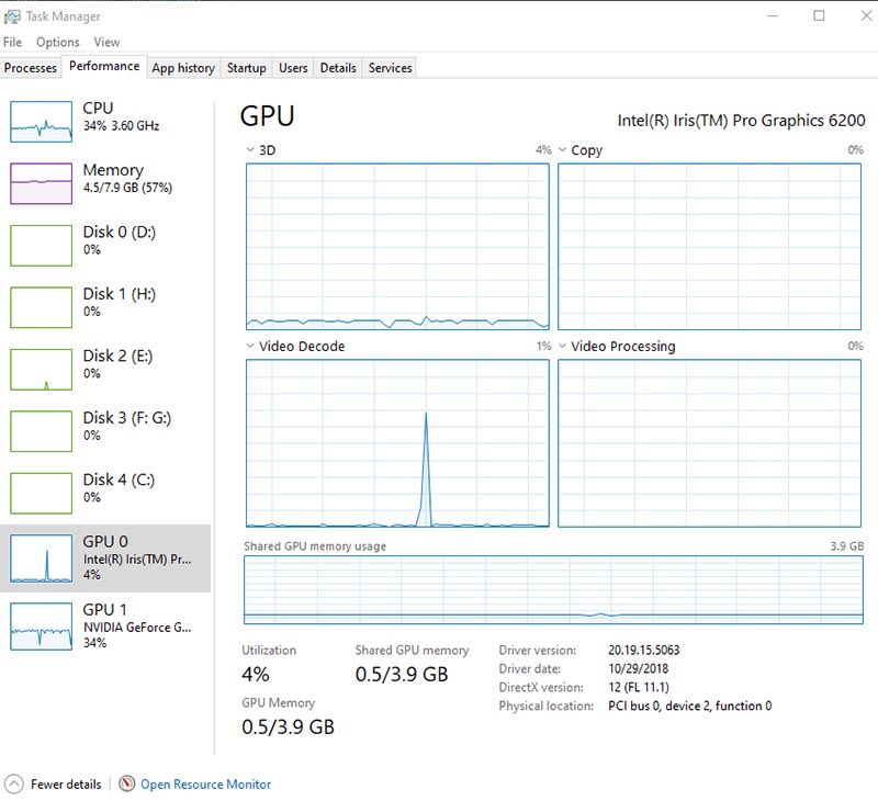 Диспетчер задач. У видеокарты NVIDIA GeForce GTX 660 при воспроизведении таймлайна грузятся процессы на: 63% Compute_0, 4% 3D и 43% Copy. Загружено 1.6ГБ бортовой видеопамяти из 2Гб.