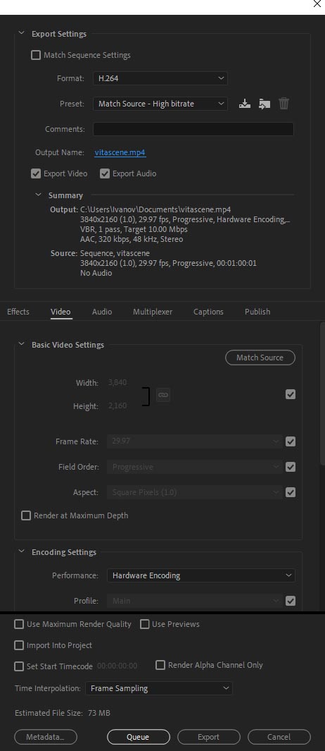 Ctrl+M и в настройках экспорта, выбираем формат: H.264 и пресет Match Source - High bitrate. По-умолчанию активировано iGPU аппаратное декодирование и кодирование (Encoding Settings > Performance: Hardware Encoding) с помощью интегрированной видеокарты Intel Iris Pro Graphics 6200.