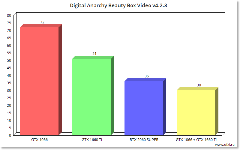 Видеокарта на чипсете GeForce RTX 2060 SUPER в 2 раза быстрее видеокарты на чипсете GeForce GTX 1060 6Gb. Также плагин Digital Anarchy Beauty Box Video v4.2.3 показал хорошую производительность в Multi-GPU режиме работы.