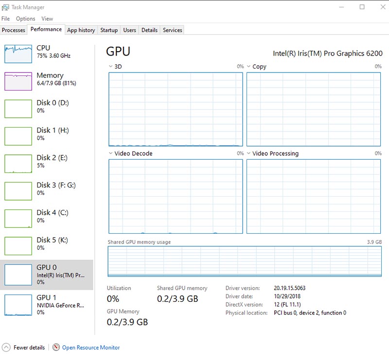 Диспетчер Задач показывает, что по сути работой только занят центральный процессор: