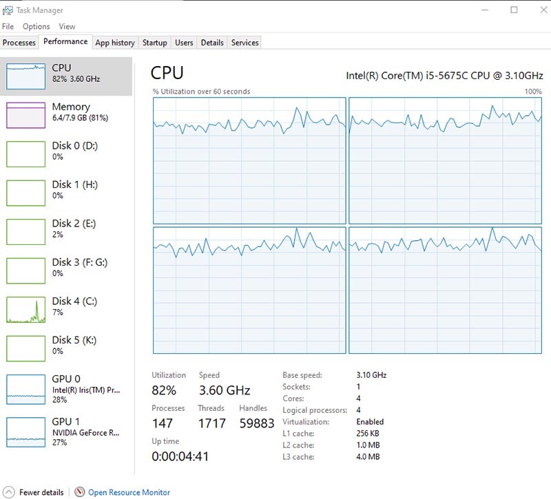 Информация отображаемая Диспетчером задач при рендеринге: загрузка четырёхъядерного процессора Intel Core i5-5675C: 82% (при тактовой частоте 3.6ГГц).