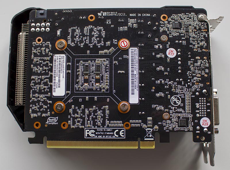 Фото видеокарты с обратной стороны (так как решение сверхбюджетное, поэтому нет никакой усиливающей пластины/бэкплейта), на винте кулера есть гарантийная наклейка.