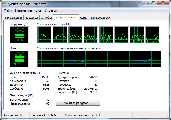 Загрузка восьми логических потоков CPU: 39% и 9.29Гбайт оперативной памяти.
