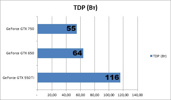 Теперь посмотрим диаграмму заявленного потребления видеокарт (GeForce GTX 750 работает без дополнительного разъема питания):