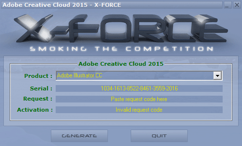Запускаем кейгенератор Adobe Creative Cloud 2015 – X-Force, выбираем продукт Adobe Illustrator CC и нажимаем на кнопку Generate. Не закрываем кейген и не сбрасываем его, до окончания активации.