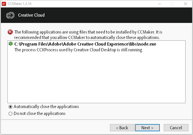Если запущен какой-то процесс Adobe, который мешает установке, то может появиться окно с информацией о процессе который мешает установке. Можно вручную его завершить, или выбрать пункт: Automatically close the applications. И нажать на кнопку: Далее > (Next >).