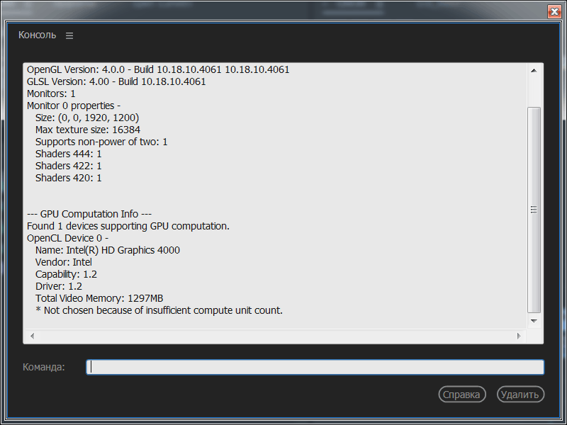 Нажимаем комбинацию клавиш: Ctrl+F12, в окне Консоль, выбираем: Консольный вид. Вбиваем в строку: GPUsniffer и нажимаем Enter. И смотрим информацию о видеокартах и режимах, которые увидел Adobe Premiere Pro CC 2017.