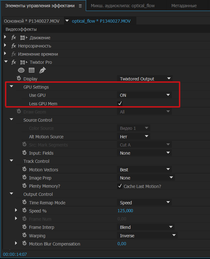 Применяем эффект к видео 1080p24, идем в Элементы управления эффектами и в настройках Twixtor Pro выставляем Use GPU: OFF, Speed – 125%.