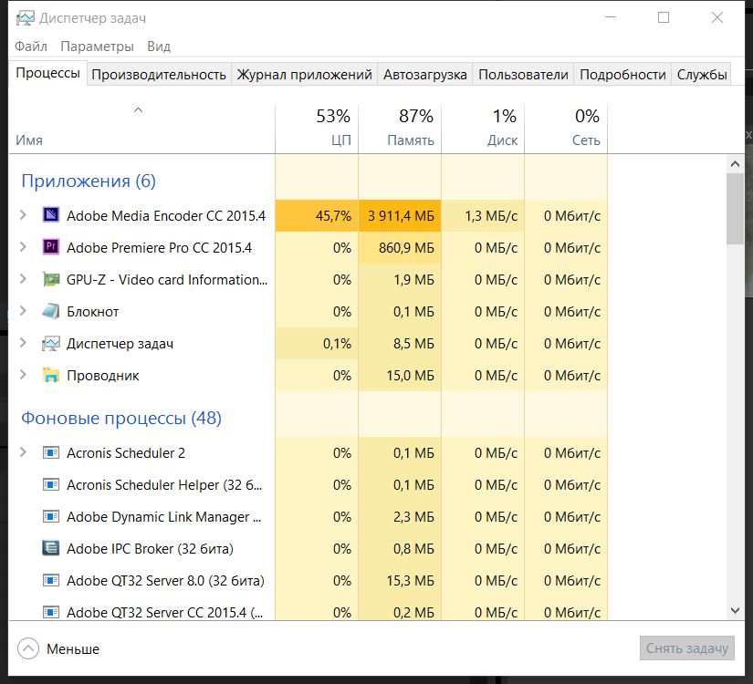 Загрузка CPU процессом Adobe Media Encoder.exe уменьшилась до 45.7%, а оперативной памяти увеличилось до 3.91Гб.