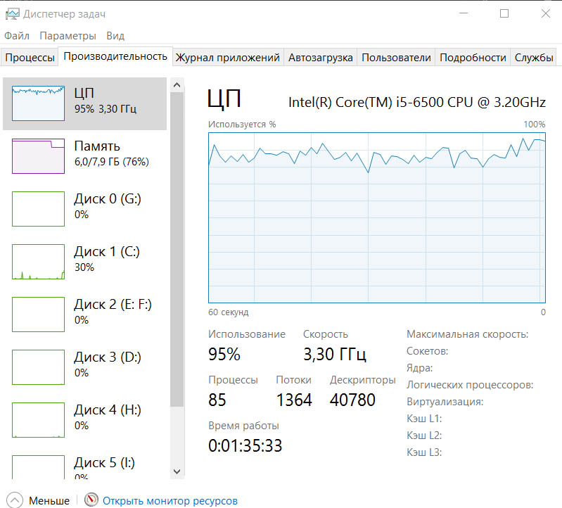 Загрузка четырех потоков процессора шестого поколения Intel Core i5-6500 составила 95%, тактовые частоты: 3.3ГГц, утилизировано оперативной памяти - 6Гбайт.