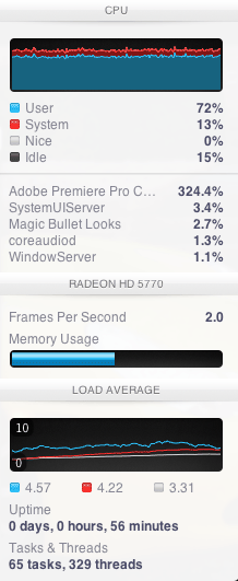 Итоговое время просчета: 12 минут и 45 секунд. Загрузка CPU / GPU плагином Magic Bullet Looks 3.0.3 (для платформы Mac OS X нет аналога GPU-Z, поэтому мы не видим на каких частотах работала видеокарта, а вместо загрузки GPU видим «попугаи» - fps / frames per second и memory usage):