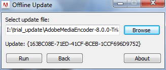 При попытке просто установить триальное обновление (через запуск инсталлятора) на скачанную оффлайн версию программы Adobe Media Encoder CC 2014, получаем сообщение об ошибке: Сбой обновления. Не удалось применить обновления. Это исправление не подходит для вашего приложения. Нажимаем на кнопку: Закрыть.