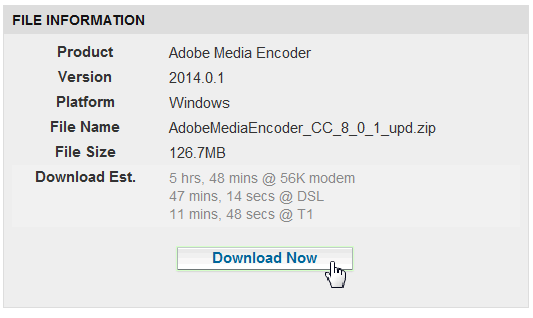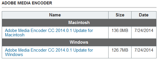 Скачиваем и устанавливаем обновление Adobe Media Encoder CC 2014.0.1 (в нем исправлен ряд ошибок, а также добавлена поддержка H.264 Level 5.2, обновлены YouTube пресеты, улучшена калибровка цвета DCP), идем на страничку: www.adobe.com/support/downloads/new.jsp и выбираем обновление для своей платформы: Update for Windows или Update for Macintosh.