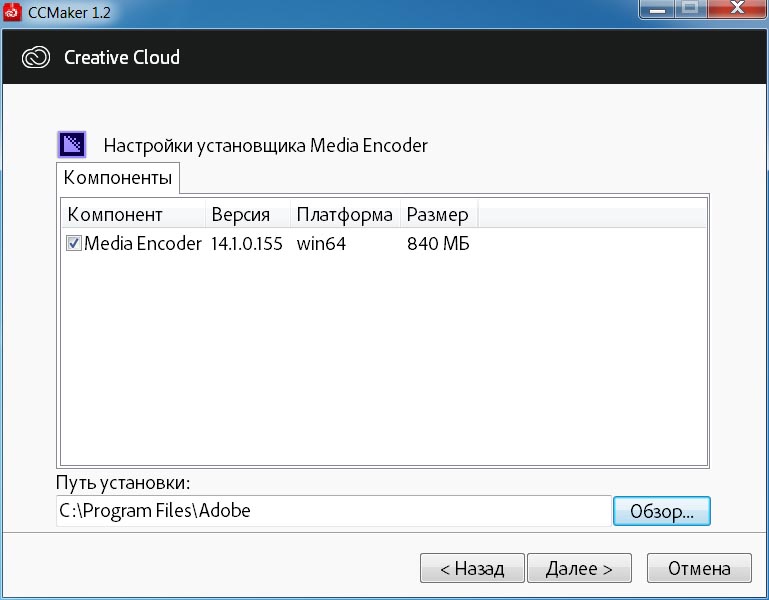 Настройки установщика Media Encoder CC. Если какие-то компоненты не хотим устанавливать, то снимаем перед ними галку. Нажимаем на кнопку: Далее >