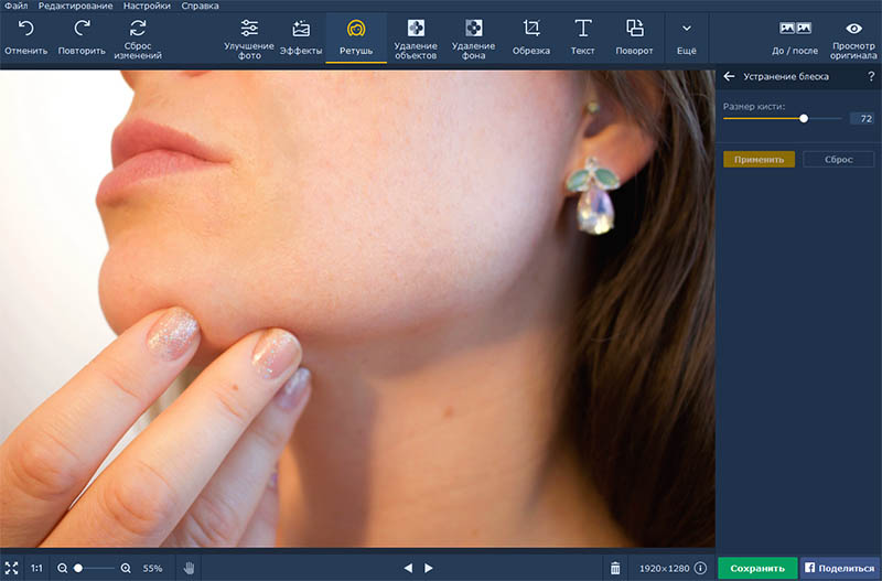 Излишний блеск? Не беда – его можно устранить буквально за пару кликов. Важно настроить размер кисти, чтобы он соответствовал участку кожи, который вы собираетесь ретушировать.