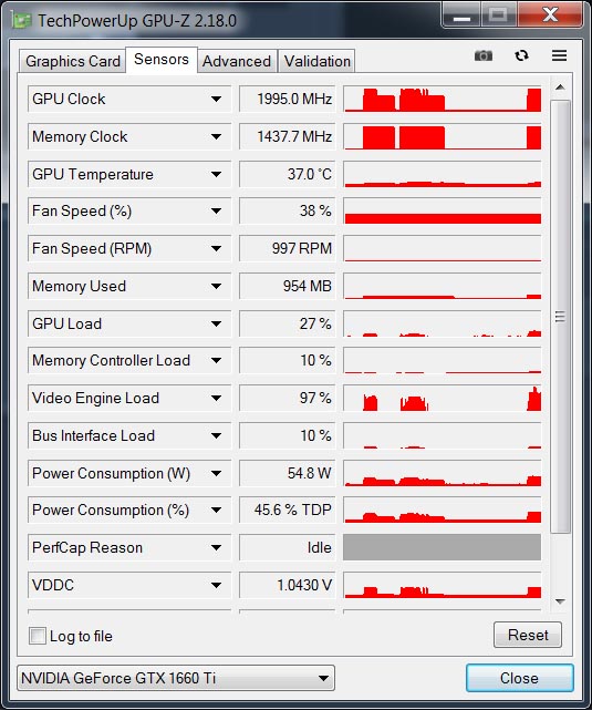 Ядро видеокарты Palit GeForce GTX 1660 Ti StormX OC работало на тактовой частоте 1995МГц, Video Engine Load (показывающий загрузку блока NVENC) - 97%. Потребление: 54.8Вт.