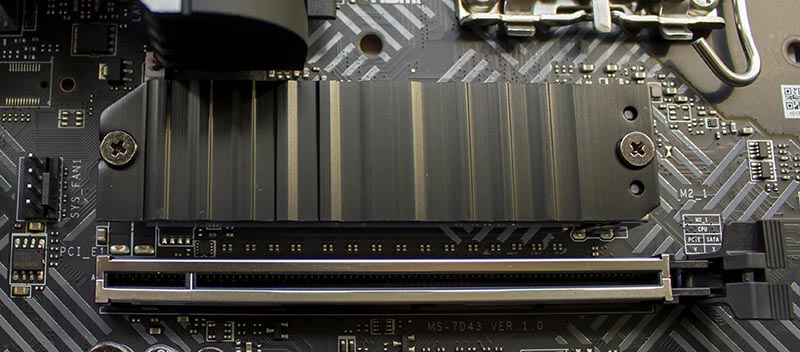 Первый M.2 слот Lightning Gen4 x4 использующий линии процессора, оснащён радиатором охлаждения M.2 Shield Frozr. Он предотвращает тротлинг и повышает производительность SSD, помогая накопителю работать на максимальных скоростях. Вид радиатора сверху, верхняя пластина покрашена в чёрный цвет: