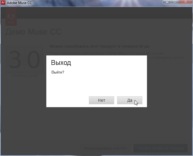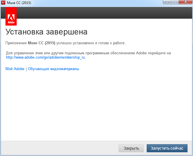 Приложение Adobe Muse CC 2015 успешно установлено и готово к работе. Нажимаем на кнопку: Запустить сейчас.