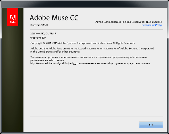 В открытой программе, выполняем команду: Справка > О Adobe Muse CC...