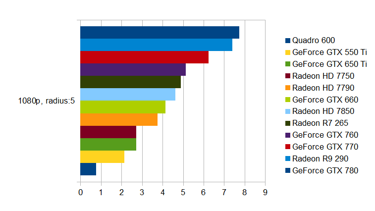 Второй график это Optimize > GPU only с настройками: 1920x1080p, 8 bits, radius: 5, чем больше значение frames/sec, тем быстрее работает видеокарта.