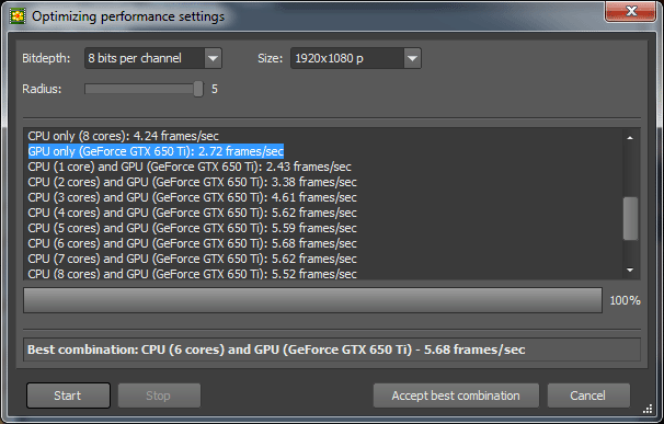 Нажимаем на кнопку: Optimize... выставляем Radius: 5 и нажимаем на кнопку: Start. И получаем Best combination / лучшая комбинация: CPU (6 cores) and GPU (GeForce GTX 650 Ti) – 5.68 frames/sec. Производительность только силами видеокарты GPU only (GeForce GTX 760): 2.72 frames/sec.