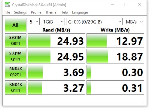 Скорость чтения/записи с помощью утилиты CrystalDiskMark 8.0.4 x64 Q1T1: 25/19 МБ/с при подключении к USB 2.0 порту с пропускной способностью до 480 Мбит/с.