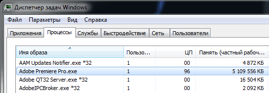 Процесс Adobe Premiere Pro.exe использует 5.1Гб памяти (из 6Гб доступной для программы Adobe Premiere Pro CC 2015).