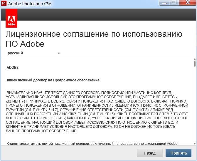 В окне Лицензионное соглашение по использованию ПО Adobe, принимаем лицензионное соглашение, нажав на кнопку: Принять.