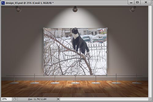 Теперь обращаем внимание на саму фотографию с завваленным горизонтом. Выполняем: Редактирование > Свободное трансформирование (Ctrl+T) и ориентируясь на забор, исправляем горизонт, но в итоге получаем дырку в правом верхнем углу. И так как воздуха над мордой кошака нет, придется выбирать для рамки другую заготовку.
