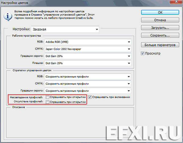 1. Отсутствие встроенного профиля или Несовпадение профиля. Чтобы эти сообщения не появлялись при открытии каждого файла, выполняем следующее...