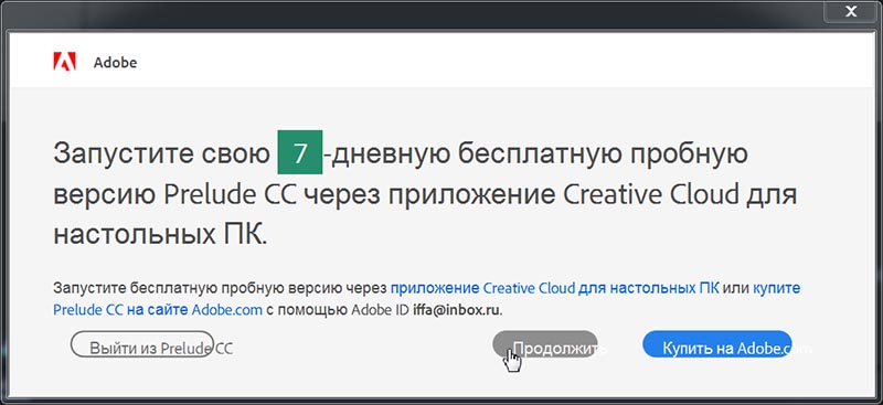 Запустится окно триала. Запустите свою 7-дневную бесплатную пробную версию Prelude CC через приложение Creative Cloud для настольных ПК. Нажимаем на кнопку: Продолжить.