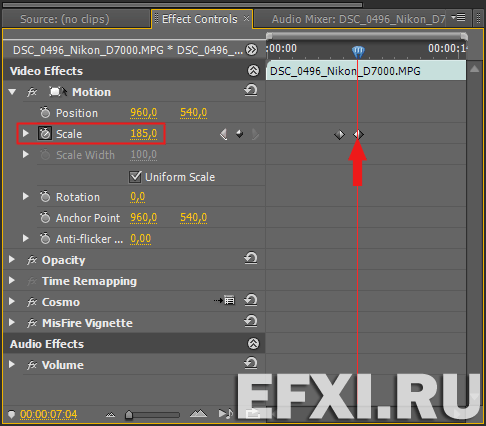 Далее, при выделенном клипе, идет в панель Effect Controls и открываем закладку Motion. Перед параметром Scale, который отвечает за изменение масштаба отображения видео, включаем будильник (Toggle animation). Таким образом мы создали первый ключевой кадр анимации.