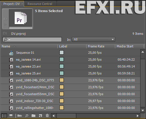 Цвет Label также можно изменить и для клипов в окне проекта. Для выделения всех клипов одного цвета, выделяет один клип в окне проекта или на линейке времени и выполняем команду: Edit > Label > Select Label Group. Будут выделены все клипы одного цвета: