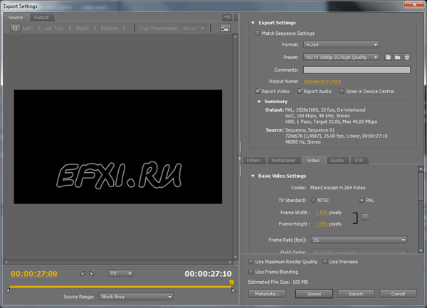 Если в проекте просчитывали видео, для предварительного просмотра и формат совпадает с настройками экспорта, то на выходе можно поставить галку Use Preview Files (Предварительный просмотр).