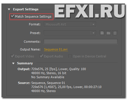 Если необходимо вывести видео с настройками последовательности, то ставим галку перед пунктом: Match Sequence Settings.