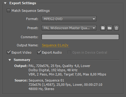 Или выбираем формат видео, например Format: (Формат:) MPEG2-DVD и если хотим согласовать настройки экспорта с настройками источника, то выбираем пункт: Match Source Attributes (применить аттрибуты источника).