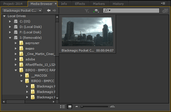 2. Добавлена поддержка новых форматов файлов: CanonRAW, compressed CinemaDNG (от камеры Blackmagic Pocket Cinema Camera). Adobe Premiere Pro CC 2014 теперь может открывать 12 bit Losslessly compressed CinemaDNG с камеры Blackmagic Pocket Cinema Camera, смотрим на результат в проводнике Media Browser.