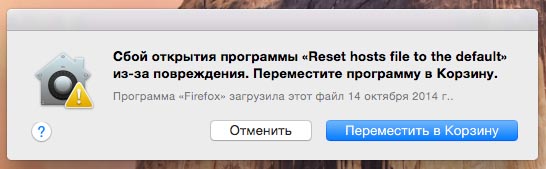 Если получаем сообщение: Сбой открытия программы Reset hosts file to the default из-за повреждения. Переместите программу в Корзину. Значит он не подходит для вашей версии операционной системы Mac OS X.