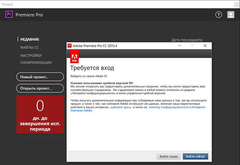 Снова запускаем программу Adobe Premiere Pro CC 2015.4 и в окне Начало, уже видим: 0 дней до завершения испытательного периода. В окне Требуется вход, нажимаем: Войти позже.