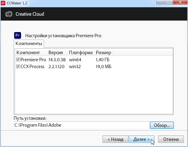 Настройки установщика Premiere Pro CC. Установка следующих компонентов: Premiere Pro CC 14.3.0.38, CCX Process 2.2.1.120.
