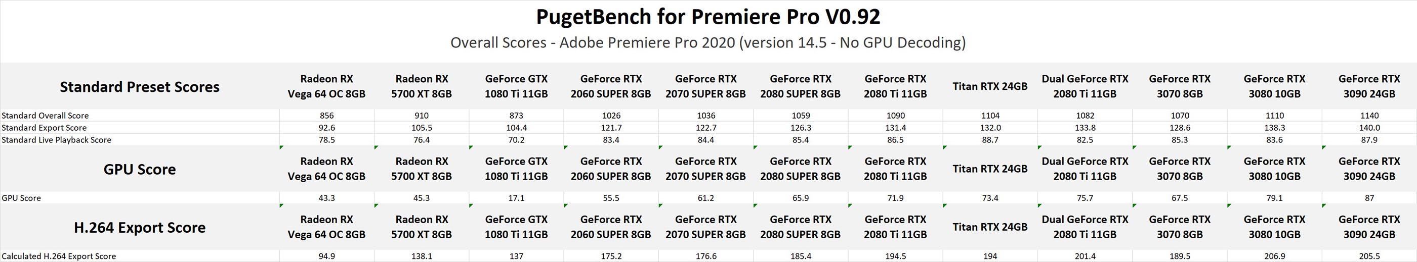 Overall Premiere Pro Performance Analysis. Общий анализ производительности Premiere Pro. В таких приложениях, как Premiere Pro, где графический процессор вторичен по отношению к процессору, многие рецензенты любят фокусироваться на экстремальных ситуациях, которые сильно загружают графический процессор. Однако сначала мы хотим посмотреть на общую производительность, которую мы видели в нашем тесте Premiere Pro с каждым графическим процессором, чтобы показать, что большинство пользователей, скорее всего, испытают в своей повседневной работе.
