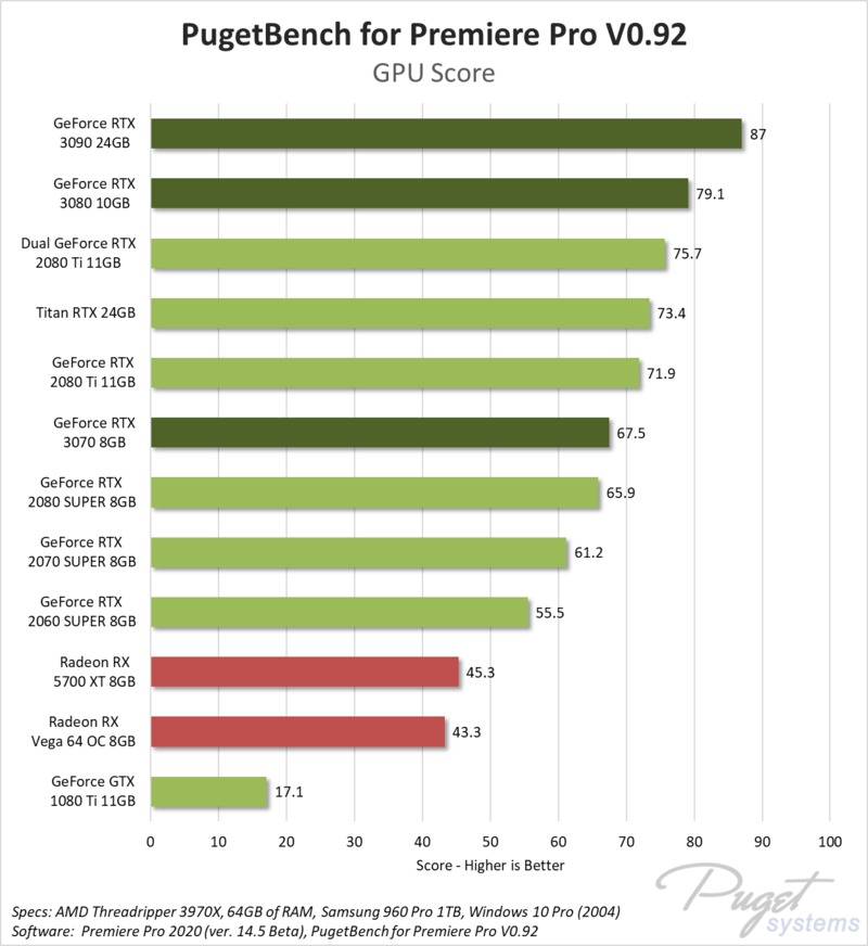 Компания Puget Systems протестировала видеокарту NVIDIA GeForce RTX 3070 в программе видеомонтажа Adobe Premiere Pro CC 2020 (v14.5). Ранее, уже были переведены статьи с тестами NVIDIA GeForce RTX 3080 и NVIDIA GeForce RTX 3090.