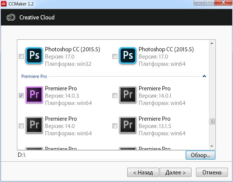 Установка. Запускаем инсталлятор CCMaker.exe. Выбираем пункт: Скачать. Выбираем программу Adobe Premiere Pro CC (2020) Версия 14.0.3. Нажимаем на кнопку: Обзор... и указываем папку для хранения файлов установки. OK.