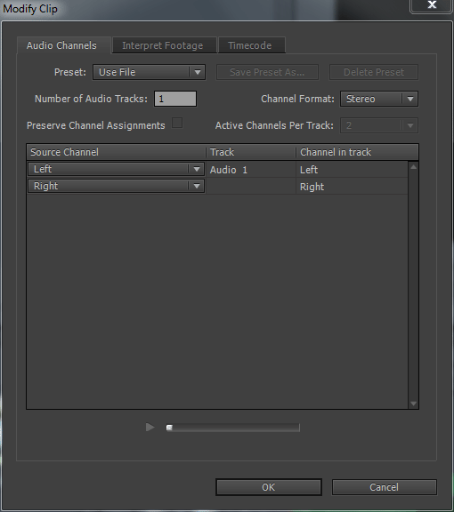 Выставляем в окне Modify Clip следующие настройки: Preset: Mono, Channel Format: Mono и выбиваем в поле Number of Audio Tracks значение: 2.