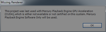 При открытии проекта, принудительно будет включен движок Mercury Playback Engine Software (т.е. CUDA движок не подхватился).