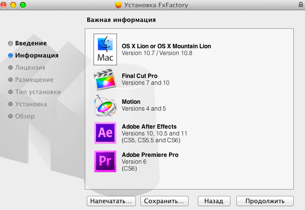 Рассмотрим установку и работу набора визуальных эффектов FxFactory 4 от компании Noise Industries для программ: Apple Final Cut Pro 7 и X, Motion 4 и 5, Adobe After Effects CS5, CS5.5, CS6 и Adobe Premiere Pro CS6. Это более 300 эффектов, генераторов и переходов, количество подключаемых плагинов постоянно увеличивается. Рекомендуются версии операционной системы: Mac OS X 10.7 и выше. Видеоускорители ATI, NVIDIA или Intel HD Graphics c 512Мбайт VRAM и выше. Запускаем инсталлятор Install FxFactory 4.0.2.pkg и нажимаем на кнопку: Продолжить.
